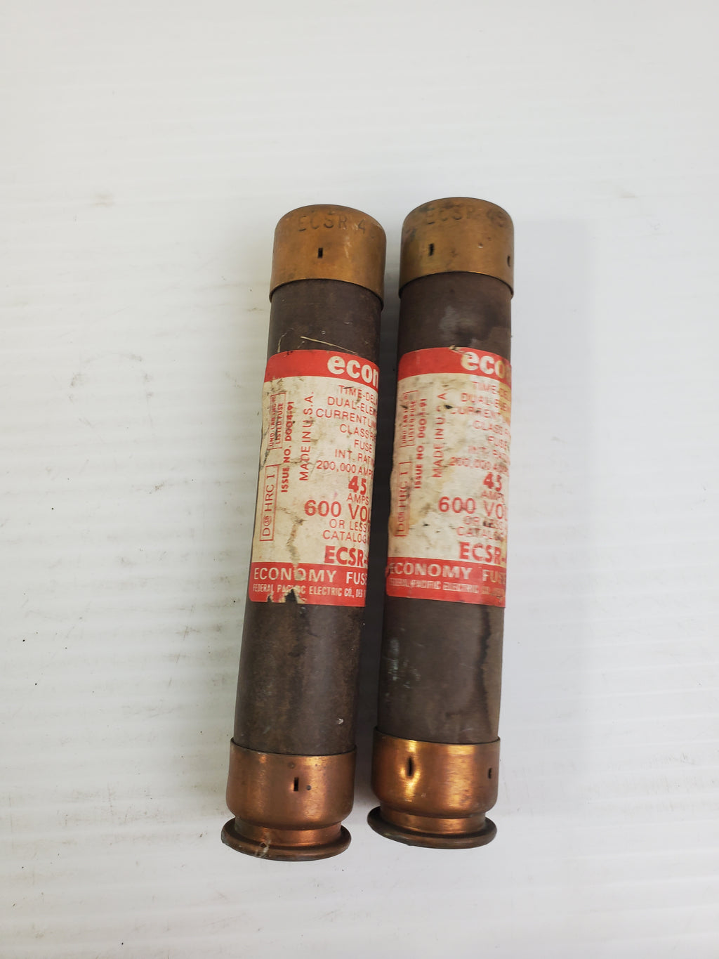 Econ Time Delay Dual Element Fuse Lot of 2 Catalog #: ECSR-45 INT Rating 200,000 Amps A.C. 45 Amps 600 Volts Used, tested, works, good cosmetic condition