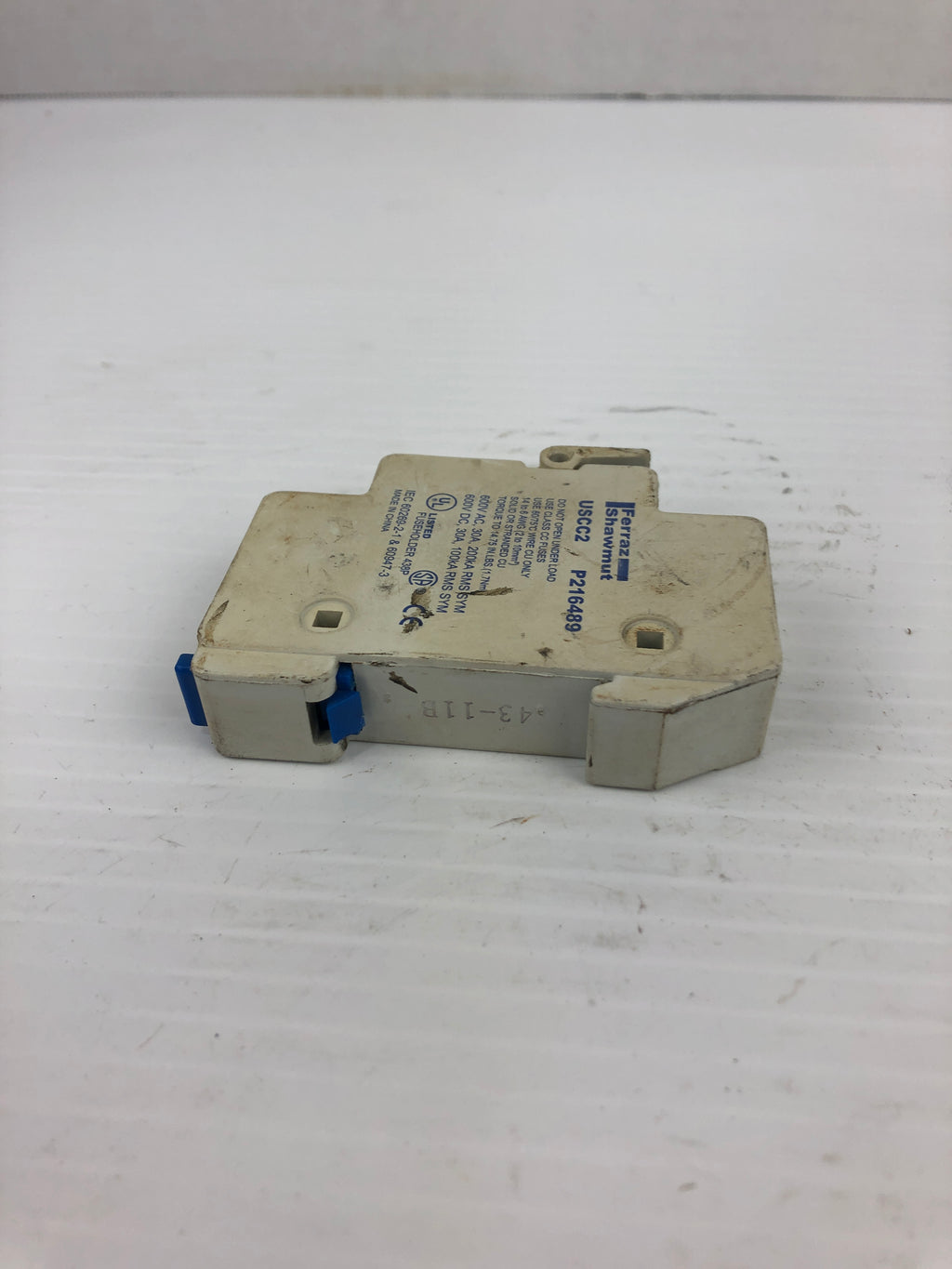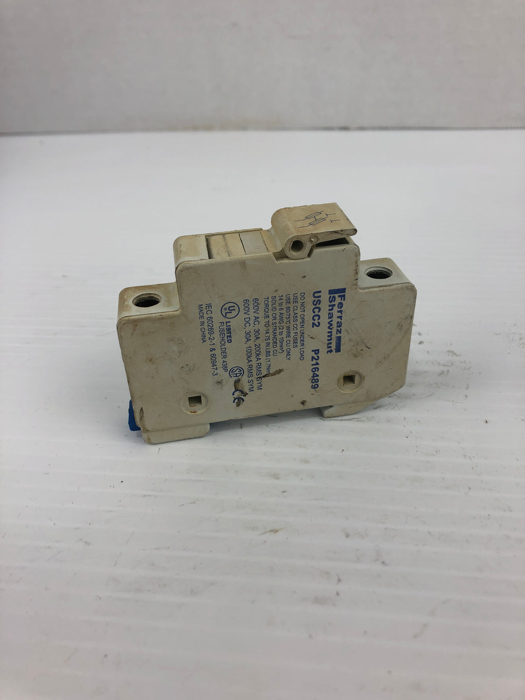 Ferraz Shawmut Fuse Holder Ultrasafe SeriesModel #: USCC2P216489Pole: 1Rating: 600VAC/VDC 30A. 200kAUsed, untested, good cosmetic condition