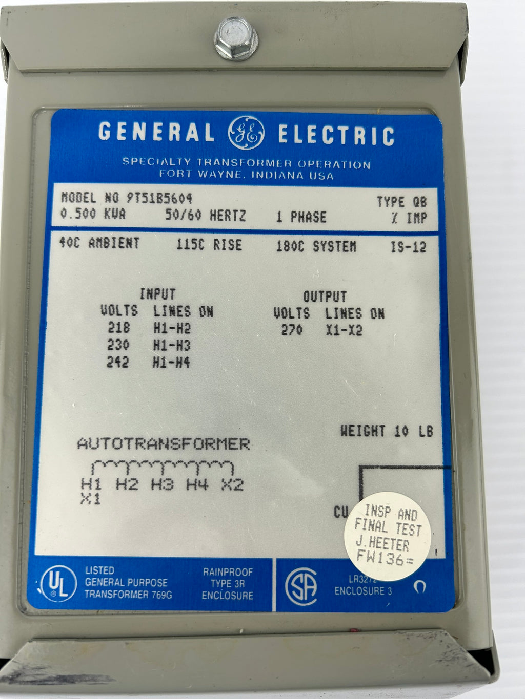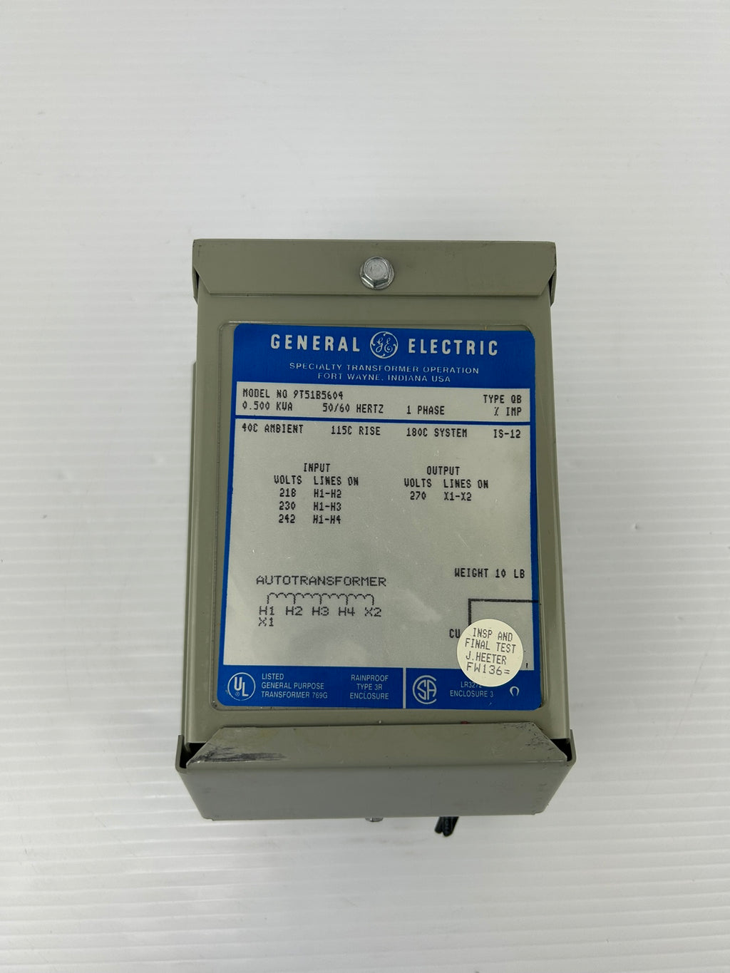 General Electric Transformer Model #: 9T51B5604 Type QB 0.500kVA 270V 1PH 50/60HzUsed, untested, good cosmetic condition