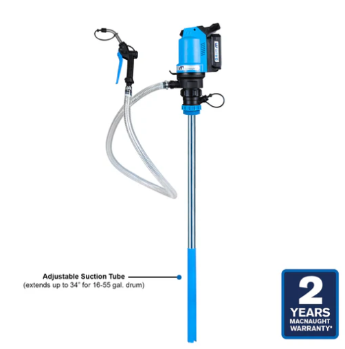 This Battery Powered 16 - 55 Gallon Oil Dispenser Pump kit has everything needed to pump Oil, ATF or Coolants. Powerhead, Stem with 5ft of 3/4 hose with On Demand Nozzle, 18V Li-Ion Battery, Battery Charger, 1 Pail Adapter. Designed for 16 Gallon or 55 Gallon Drums up to 140W. Place the BOP205 into any 16 - 55 gallon oil drum, flick the Powerhead on, and engage the on-demand flow nozzle. It's that easy! Eliminates the need for hand pumping or air operation.