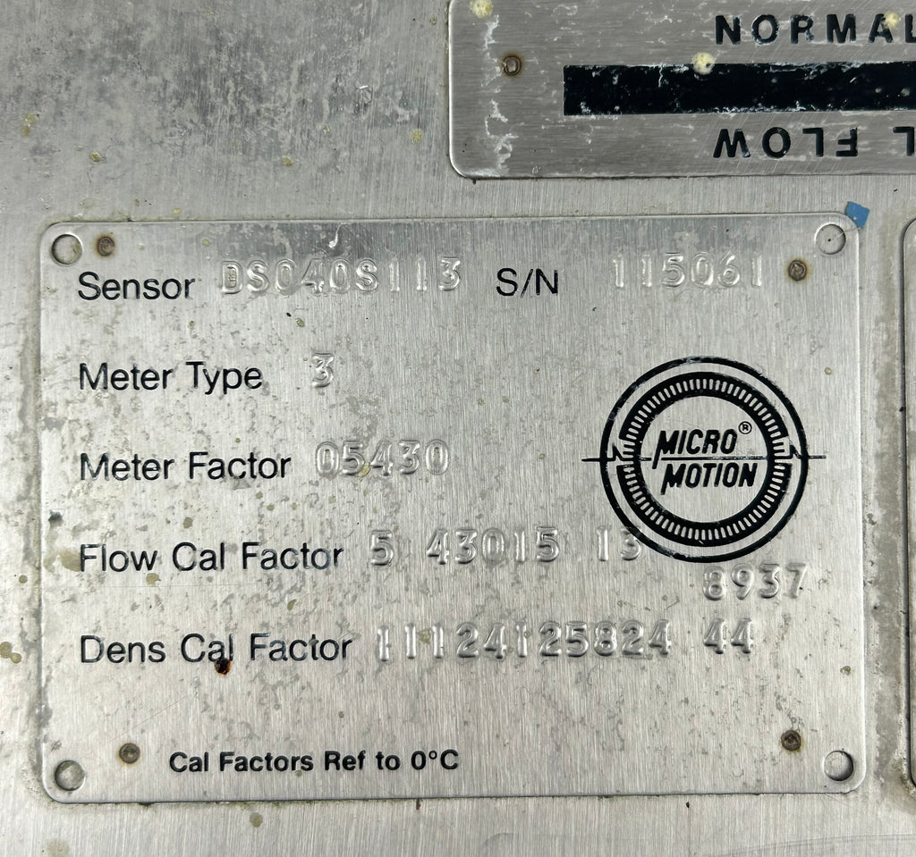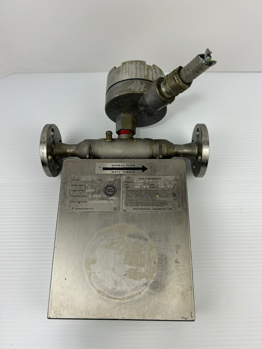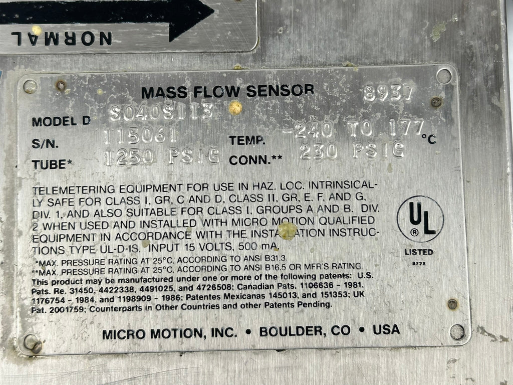 Micro Motion Mass Flow Sensor Model #: DS040S113Meter Type 3 1250PSIG 500mA 15VUsed, untested, shows some wear