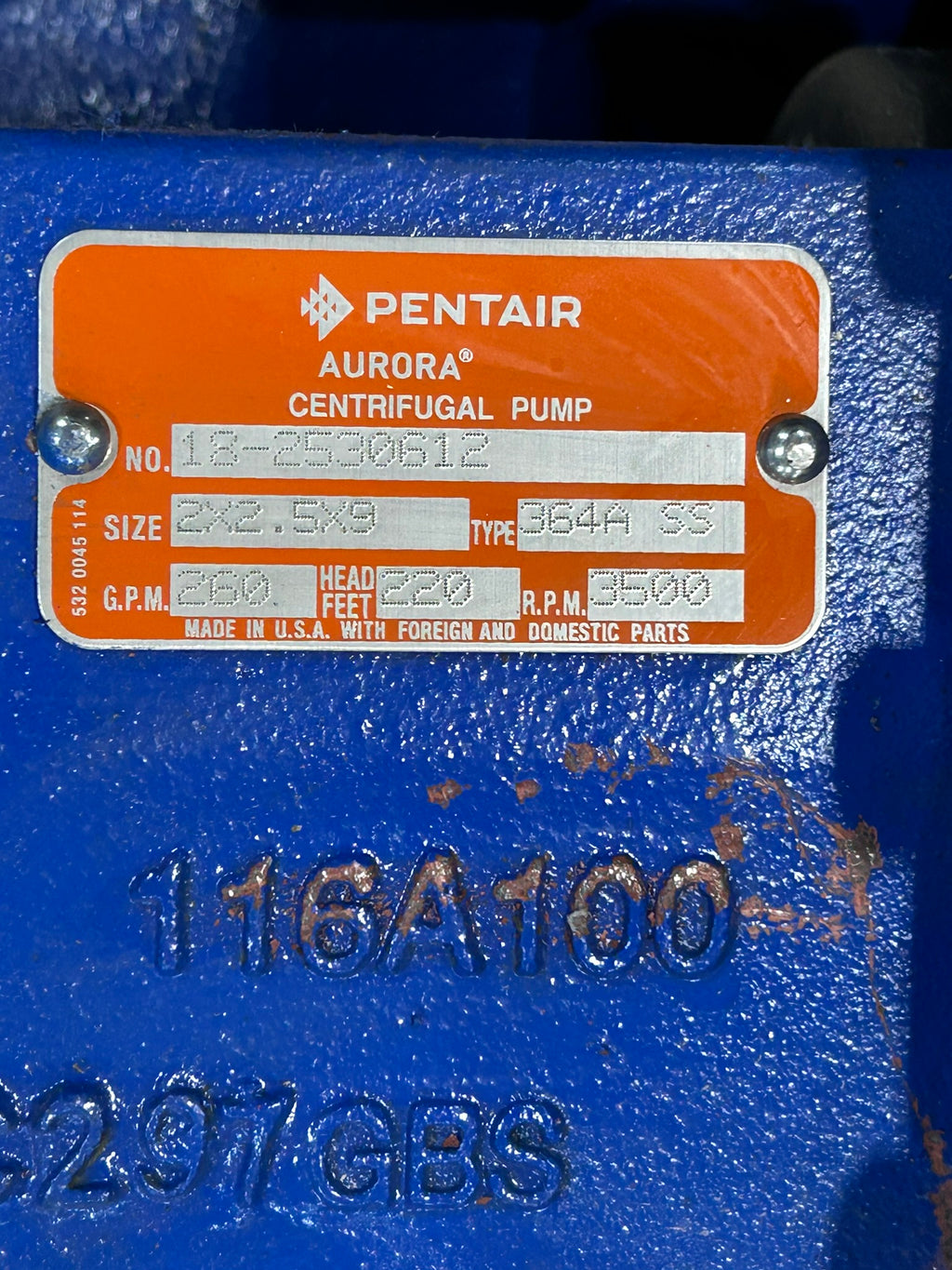 Pentair Centrifugal PumpModel #: 18-2530612Size 2X2.5X9Type 364ASSG.P.M. 260Head Feet 220 RPM 3500Used, untested, good cosmetic condition