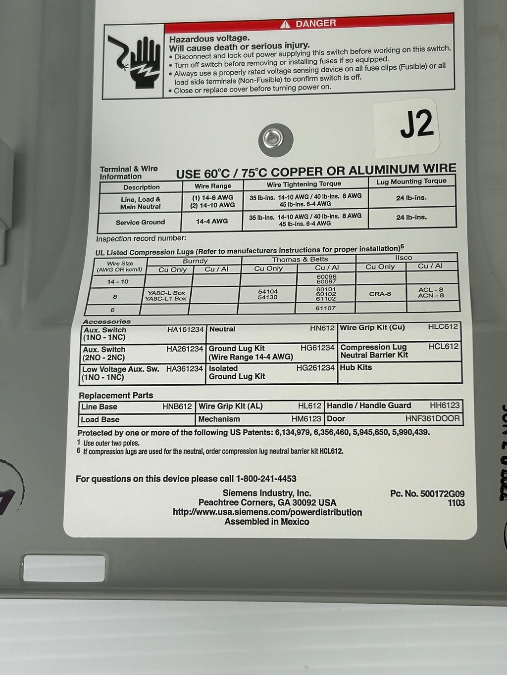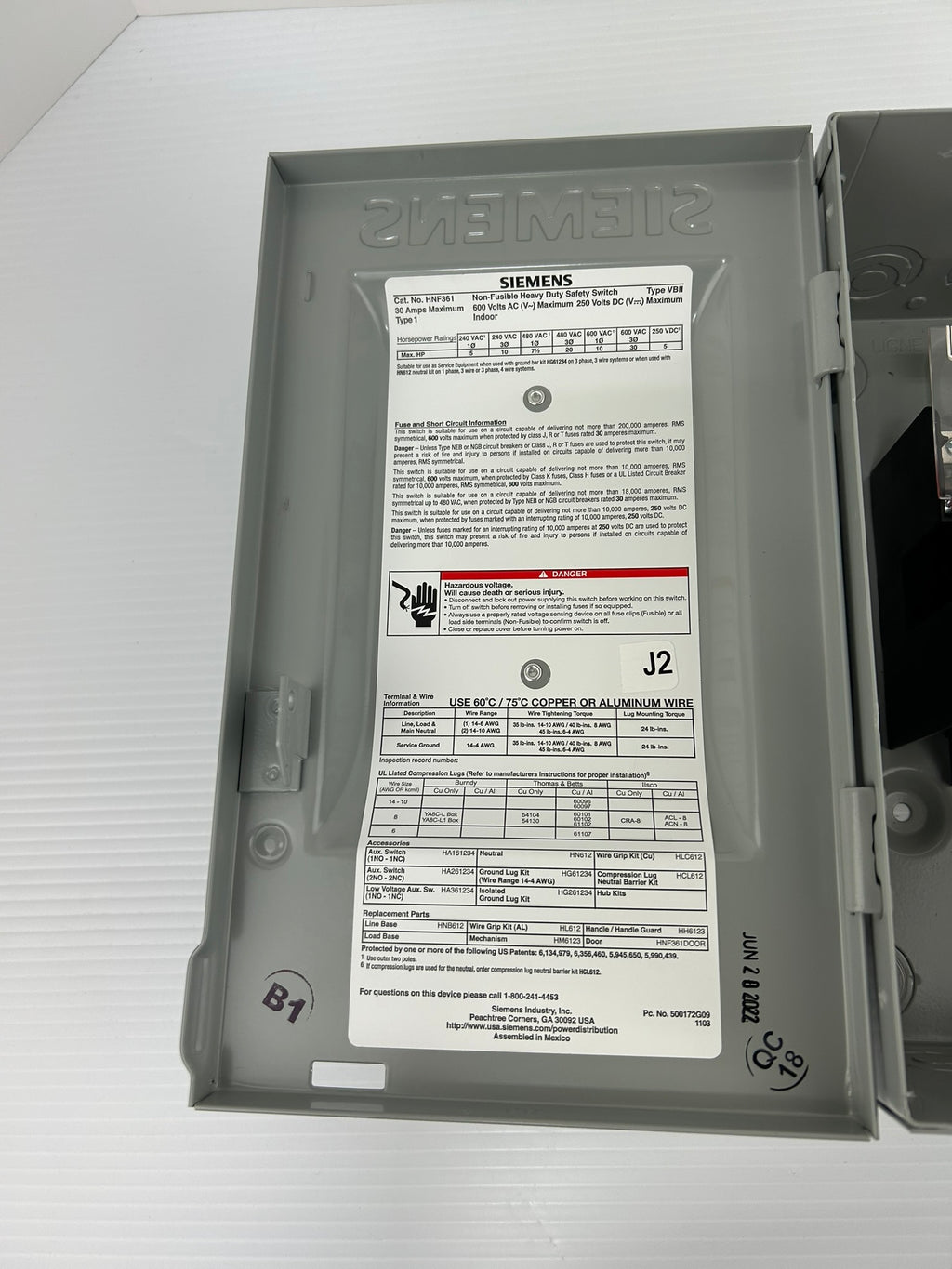 Siemens HNF361 Non-Fusible Heavy Duty Safety Switch 30A 600VAC 250VDC Indoor