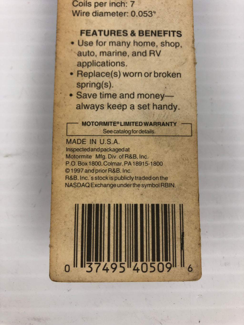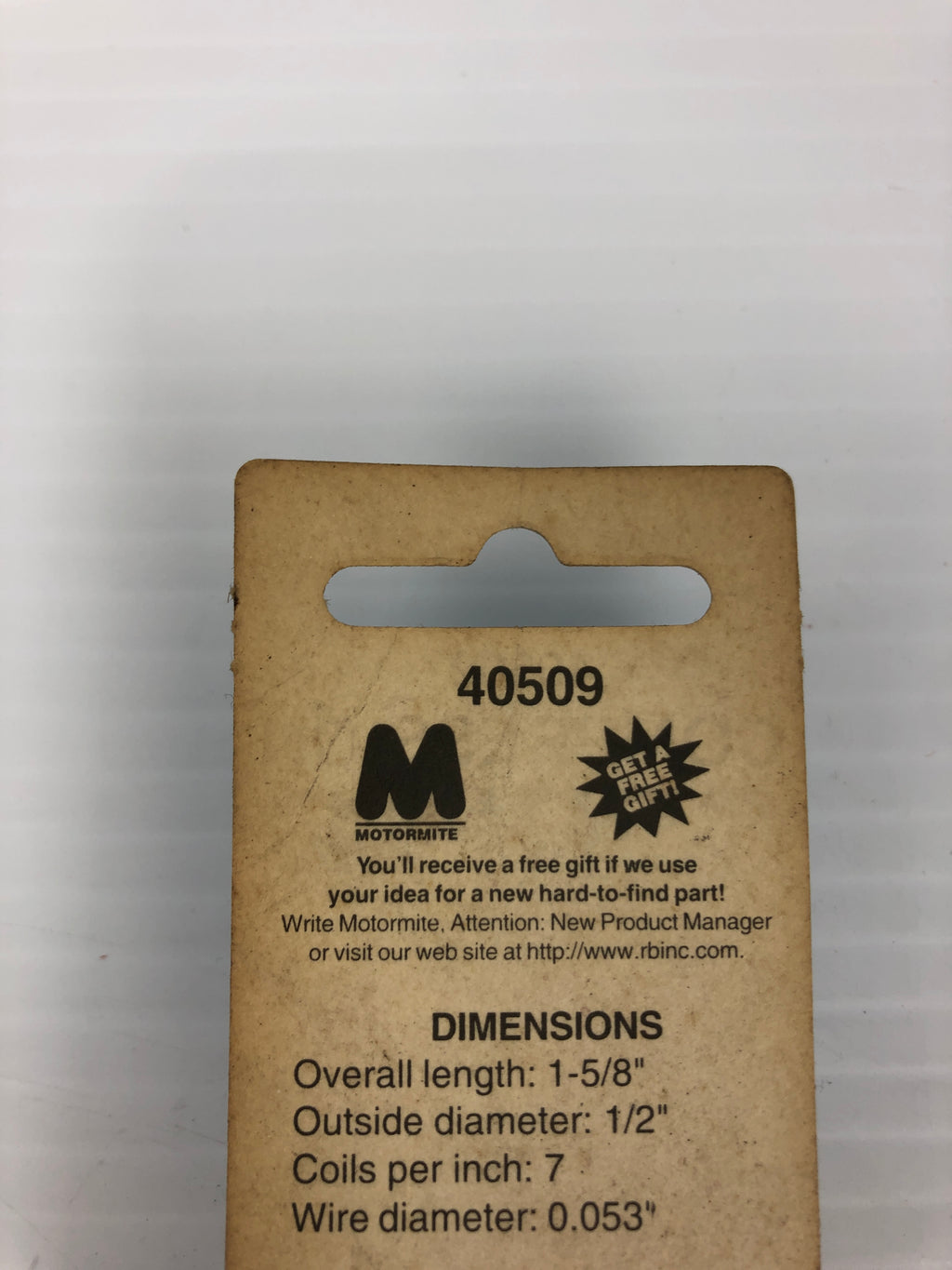 Spring-Tite Compression Spring Model #: 40509 Overall Length 1-5/8" Outside Diameter 1/2" Wire Diameter 0.053" New, old stock, may not ship in original package