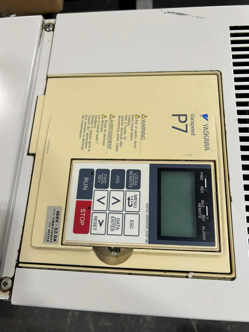 Yaskawa AC Drive Varispeed P7Model #: CIMR-P7U4024Type 1 EnclosureUsed, untested, shows wear, please see photos